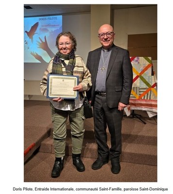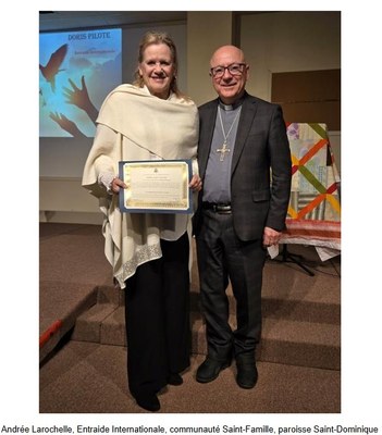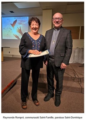 Nous voulons rendre grâce pour l’engagement généreux de personnes bénévoles qui, par leur dévouement, font grandir nos communautés chrétiennes. Nous soulignons tout particulièrement Mme Raymonde Rompré, pour son engagement fidèle au sein de la communauté Sainte-Famille. Nous reconnaissons également l’implication remarquable de Mme Andrée Larochelle et de Mme Doris Pilote, pour leur service au sein d’Entraide Internationale, communauté Sainte-Famille. Que le Seigneur les bénisse pour le temps, l’énergie et le cœur qu’elles donnent au service des autres, et qu’il inspire encore longtemps leur chemin de foi et de solidarité. |