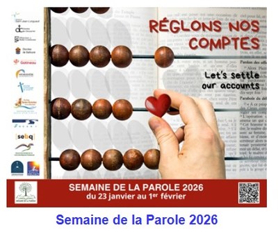 La Semaine de la Parole 2026 est une forme de festival de la Parole de Dieu. Elle est le fruit d’une collaboration entre plusieurs partenaires. (source : infolettre diocèse de Chicoutimi, abbé Jean Gagné)